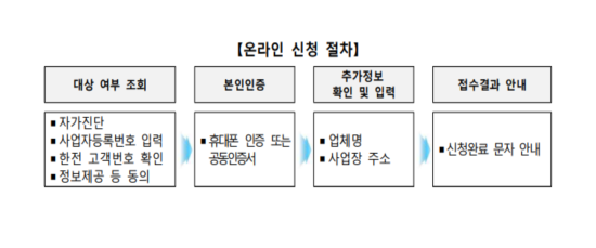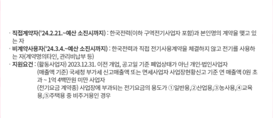 ◼현재 사업체를 운영 중이며 연간매출액이 1억 4백만 원 미만인 사업자, 주거용으로 분류되지 않는 사업장용 전기요금을 납부하고 있는 개인이나 법인사업자라면 신청 가능합니다.