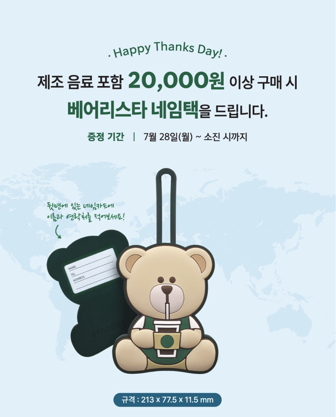 이번엔 ‘Happy Thanks Day’를 맞아, 제조 음료 포함 2만 원 이상 구매 고객에게 ‘베어리스타 네임택’을 증정하는 특별한 이벤트가 열렸습니다.귀여운 테디베어 모양의 네임택은 실용성과 귀여움을 동시에 갖춘 아이템으로, 여행이나 가방 포인트로도 활용도가 높습니다!