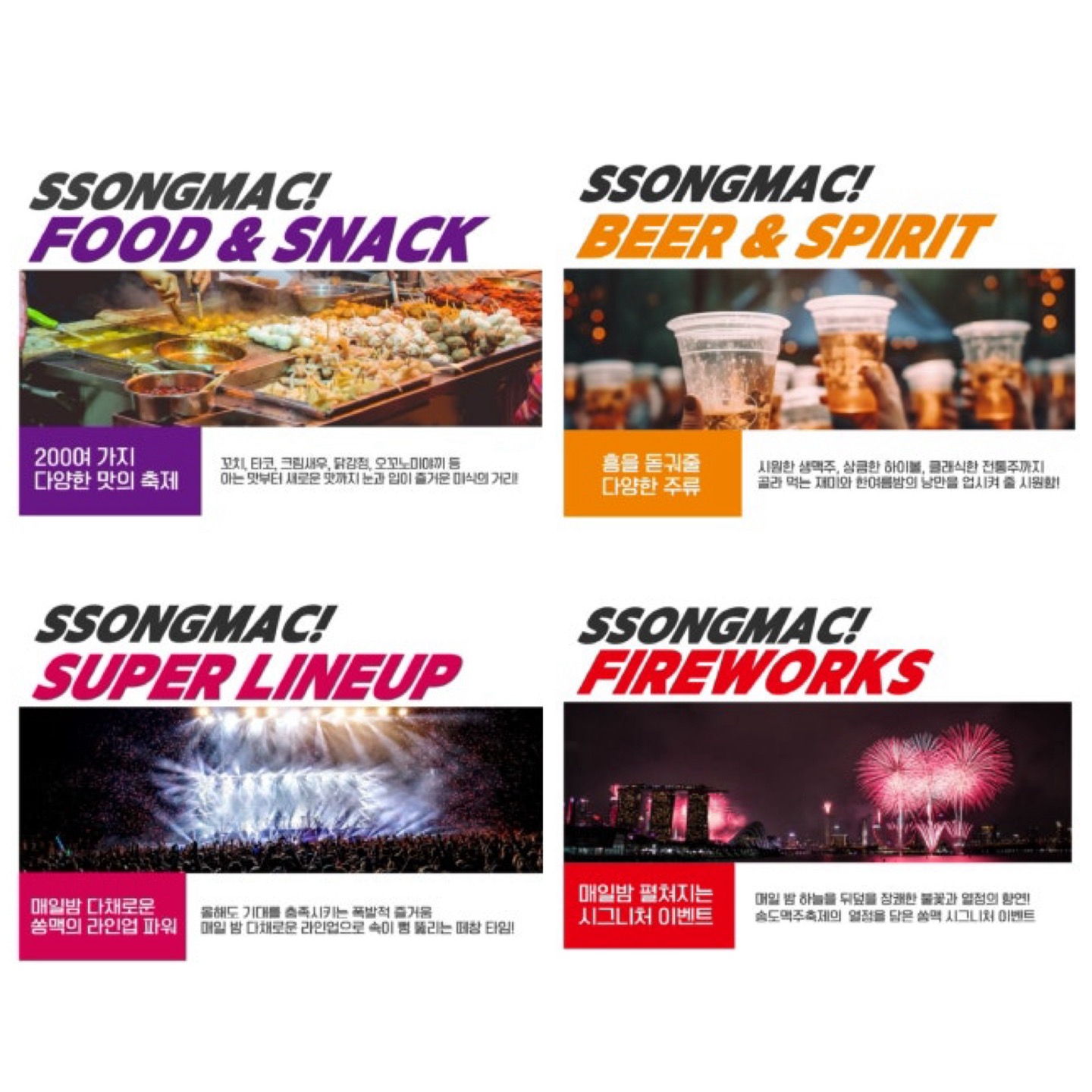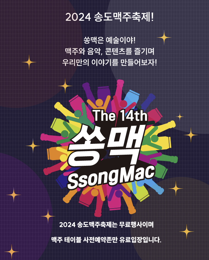 2024년 벌써 14회를 맞이한 송도 맥주축제 '쏭맥'은 다양한 음악과 더불어 시원한 맥주를 함께 즐기며 무더위를 날려 버릴 수 있는 인천 최대 축제입니다.